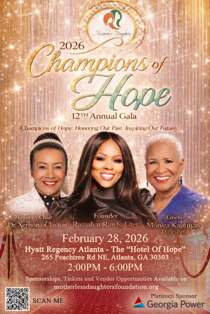 You are cordially invited to walk the red carpet and join us for an unforgettable afternoon at the 12th Annual Motherless Daughters Foundation Gala — Champions of Hope. This signature event will take place at the iconic Hyatt Regency Atlanta, located at 265 Peachtree Street in the heart of downtown Atlanta, with festivities beginning promptly at 2:00 PM.